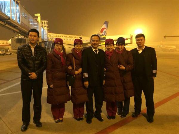 2012届航空服务专业毕业生黄沙蛟(左1),现任中国南方航空公司重庆分公司空中乘务(安全员),此图为其与机组人员合影