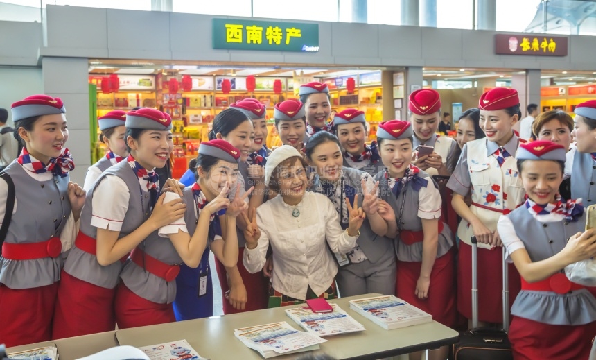 “这是机场五四青年节的活动吗?”“汉代礼仪表演很好。”“中国传统礼仪还是不能丢。”现场意犹未尽的旅客们纷纷找参演人员拍照留恋,“空姐”们也向旅客送上玫瑰花,带给大家节日的问候与祝福。连之前因为湖南卫视“旋风孝子”节目而火了一把的包贝尔的妈妈也跻身人群中,和参演的空姐们不断合照。