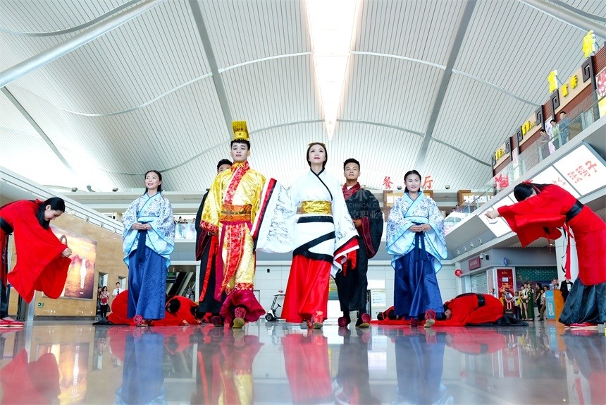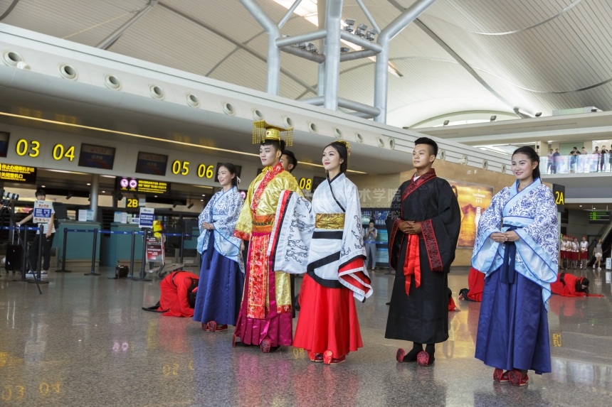 在机场大厅里,这群身着汉服的女子对古人在行走、立容、行礼等方面所遵从的礼仪进行演示。认真的表情、舒缓的动作、优美的姿态,不仅诠释了古典礼仪之美,还衬托出表演者美好的气质和风度,也吸引了阵阵掌声。
