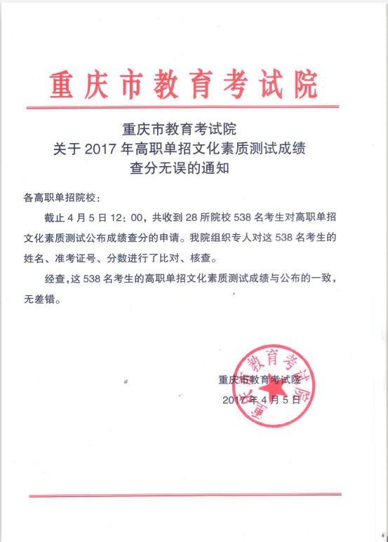 关于2017年高职单招文化素质测试成绩查分无误的通知