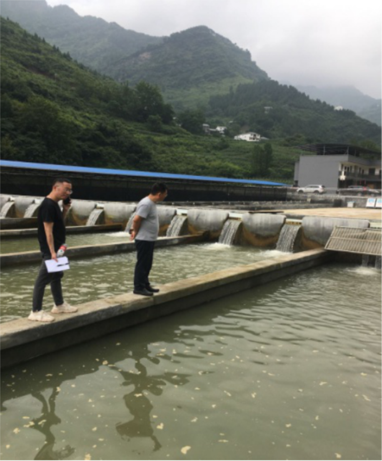郭书记在蔡森坝村驻村第一书记罗军陪同下参观冷水鱼养殖基地。
