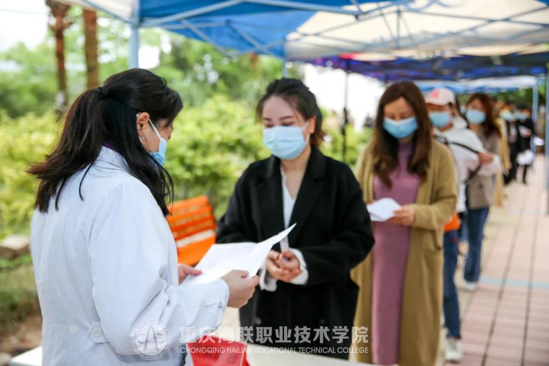 疫苗接种现场,参加疫苗接种的师生按照已通知的分段时间有序前来,在现场指导老师的指引下,大家戴好口罩,有序地排队测试体温、出示“育苗通”二维码、健康码进入登记区。