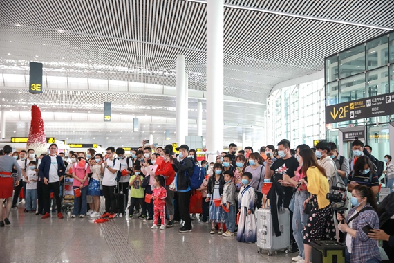 活动接近尾声时,身穿空乘制服的表演者们缓缓走入航站楼中央,一曲激情奋进的《我们都是追梦人》唱响了整个航站楼。紧接着,全体表演者们再次登台,挥舞着手中的国旗,青春洋溢。