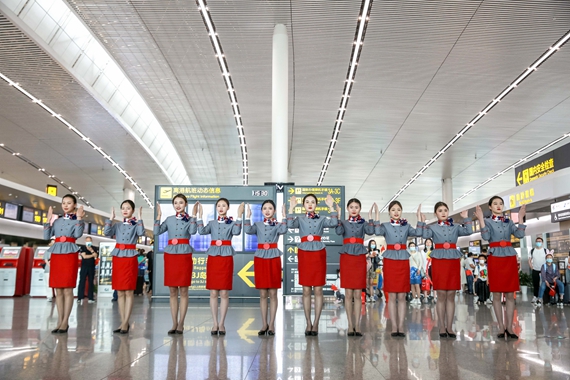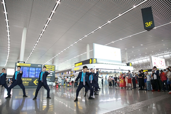 当旅客们还对上一段节目意犹未尽时,一群高挑靓丽身着制服的“空乘”们华丽现身。伴随着轻快的音乐,“空姐”们优雅的舞姿,整齐划一的动作,举手投足之间落落大方,十分具有观赏性,引来现场旅客纷纷拍照、录像……