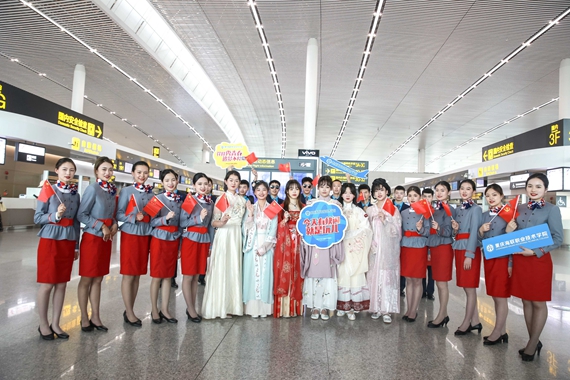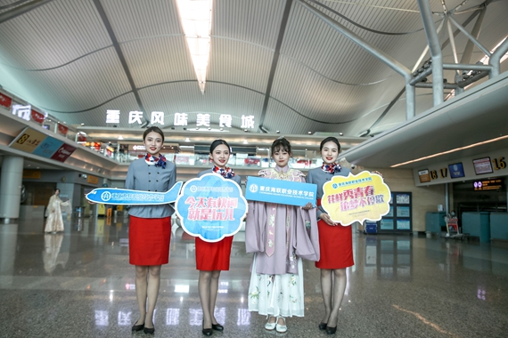 当天下午,重庆江北国际机场航站楼内,正当旅客们拖着行李箱办理乘机手续的时候,一曲清澈悠扬的古筝旋律在航站楼内响起。随后,身穿各式华丽汉服的少女们伴随着悦耳的古筝声缓缓出场,旅客们纷纷驻足围观。