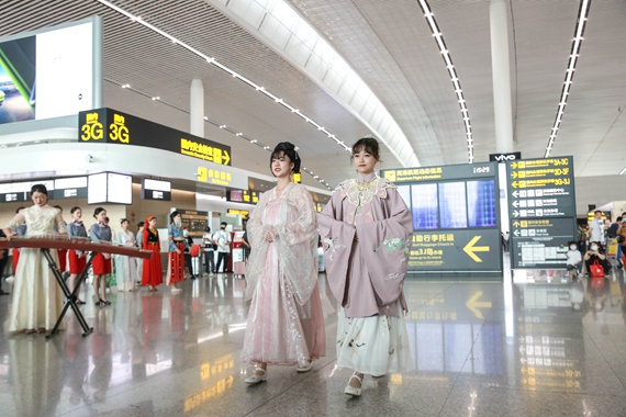 感受华夏之美,传承中国文化。少女们踩着轻盈的步伐,一颦一笑间将中国汉服演绎出新境界,为在场的旅客们进行了一场艺术的洗礼,引来现场好评不断。