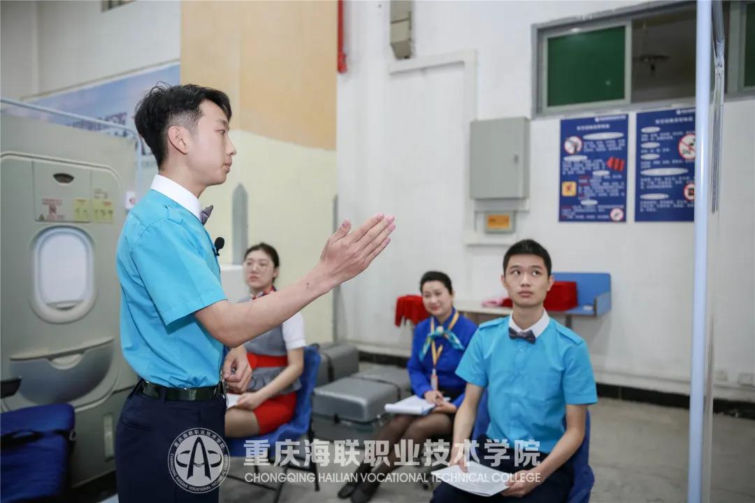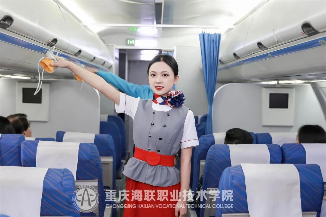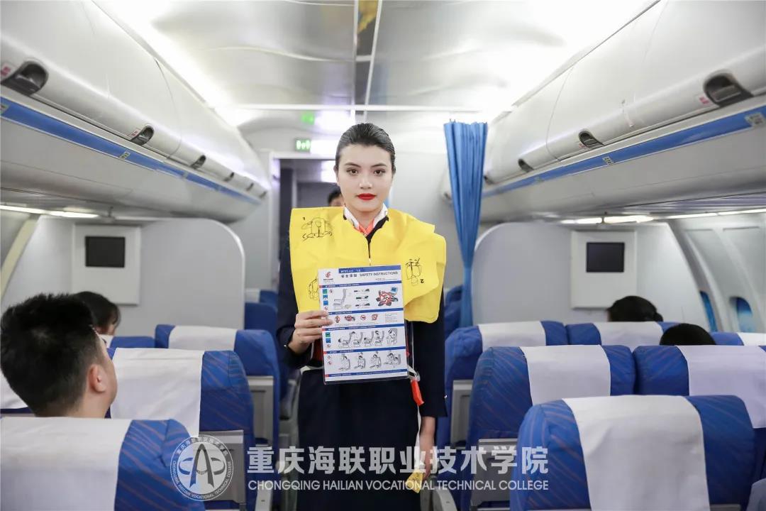 安全演示和应急出口,是每一位乘务员的必备技能,也是空乘学子在日常学习中反复加以训练的实操课程。同学们通过这个环节向大家演示了机上应急设备的使用方法,和机上应急出口的重要提示,展现出了扎实的专业素质。