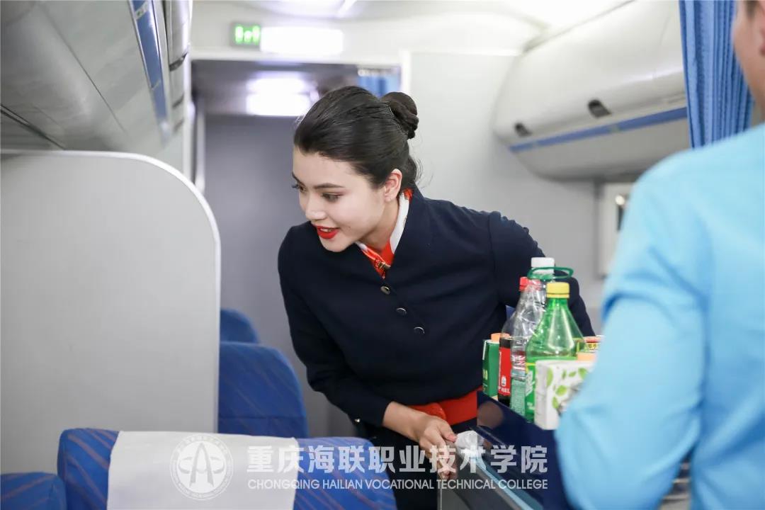 以客为尊的客舱服务环节,同学们瞬间化身为专业的“准空乘”沉着应战,以高标准、高水平给客舱内的师生们带来了极致的服务体验。