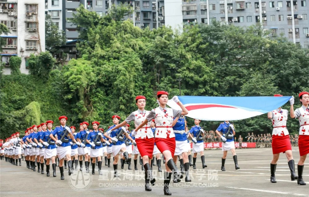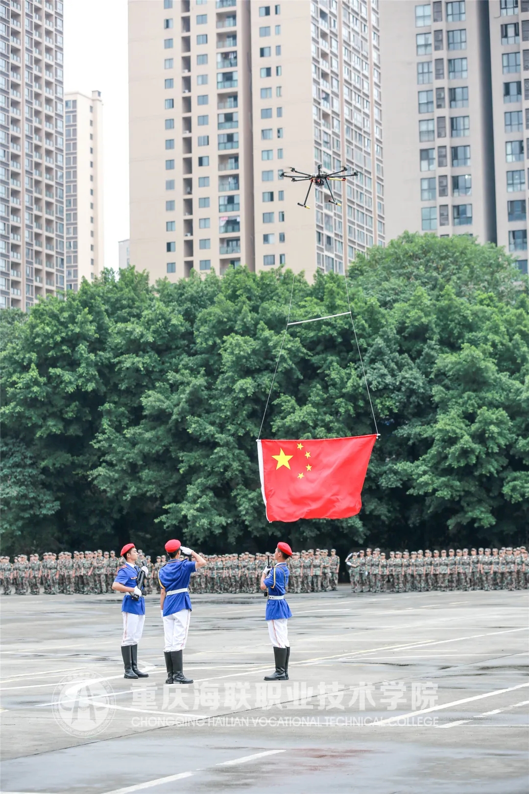 无人机挂着鲜艳的五星红旗在嘹亮的国歌声中冉冉升起,全场师生庄严行注目礼,典礼也由此拉开了序幕。高职和五专的新生们步伐整齐划一、口号响彻云霄、眼神坚毅自信,各连队走过主席台接受全场的检阅。