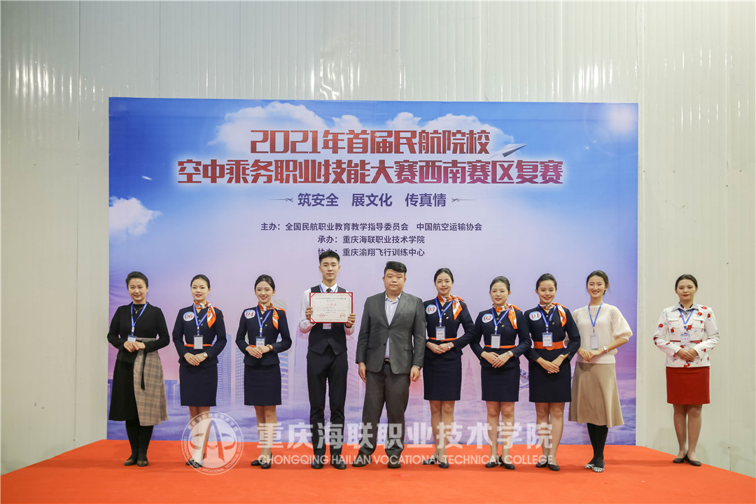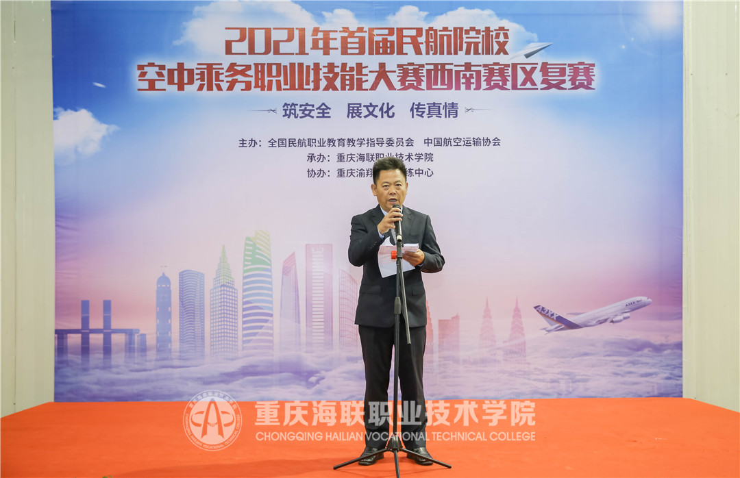 10月14日下午,由全国民航职业教育教学指导委员会、中国航空运输协会主办,买球官方网站承办的2021年首届民航院校空中乘务职业技能大赛西南赛区复赛正式闭幕。中国航空运输协会培训部主管李超、买球官方网站党委书记郭增琦、中国民航科普基金会专家委员会副主任张峰琳、重庆渝翔飞行训练中心客舱部经理阎楚琳、泛美集团副总裁谈国萍、泛美集团总裁助理邓彩霞等出席大赛闭幕式。