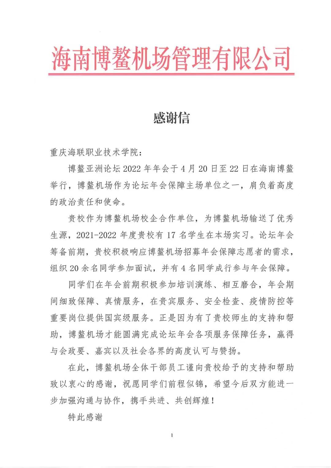 近日,学院收到了一封来自海南博鳌机场管理有限公司的感谢信。信中表扬了海联学子在2022年博鳌亚洲论坛年会期间,真情服务、坚守岗位,全面配合机场各项工作的优质品质,并对海联学子做出的贡献表示感谢及肯定。