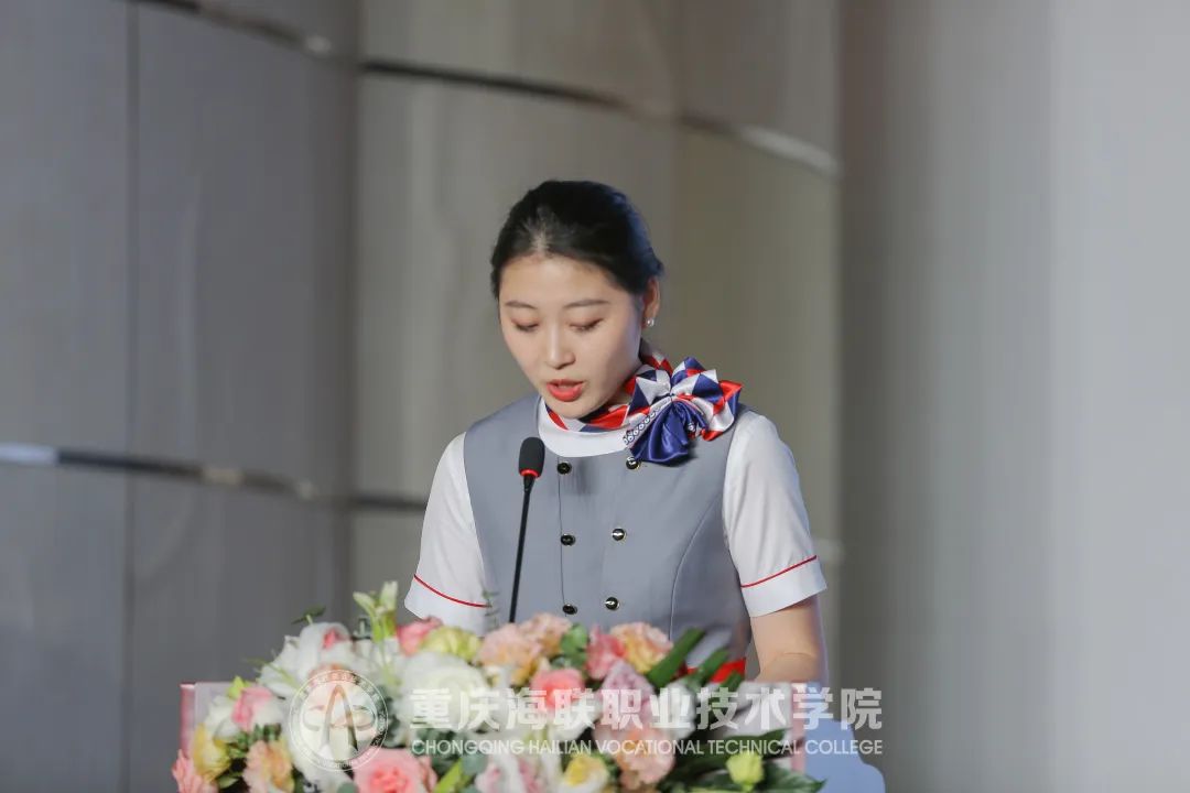 空中乘务系刘春丽同学作为毕业生代表发言,她回首在海联的三年时光里,自己有成长和蜕变、思考和收获。她感谢学院提供的多样化发展平台,让她创造条件一路追梦。她表示:“奋斗是青春最亮丽的底色,行动是青年最有效的磨砺。有责任有担当,青春才会闪光。”