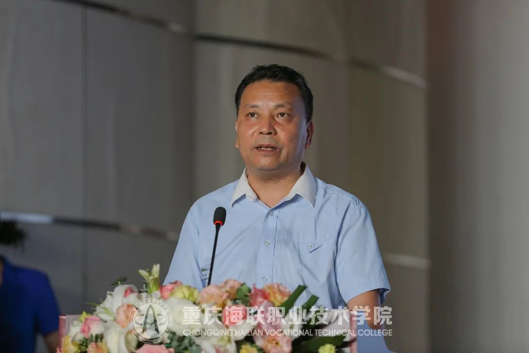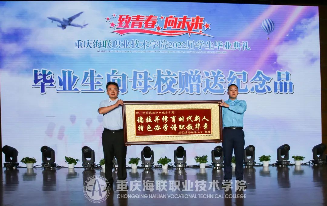 学院副院长张邱代表学校接受2022届毕业生的赠礼。撰写“德技并修育时代信任,特色办学谱职教华章“的金色牌匾,表达了海联学子对母校的深深谢意。