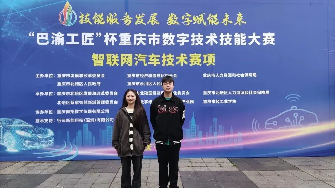3月31日—4月1日,由重庆市发改委、市经信委、市人社局、北碚区人民政府、永川区人民政府主办的“巴渝工匠”杯重庆市数字技术技能大赛“智联网汽车技术”赛项比赛在重庆市轻工业学校举行。2022级智能网联汽车技术专业学生张兰、张浩代表学校参赛,张兰获得优胜奖。