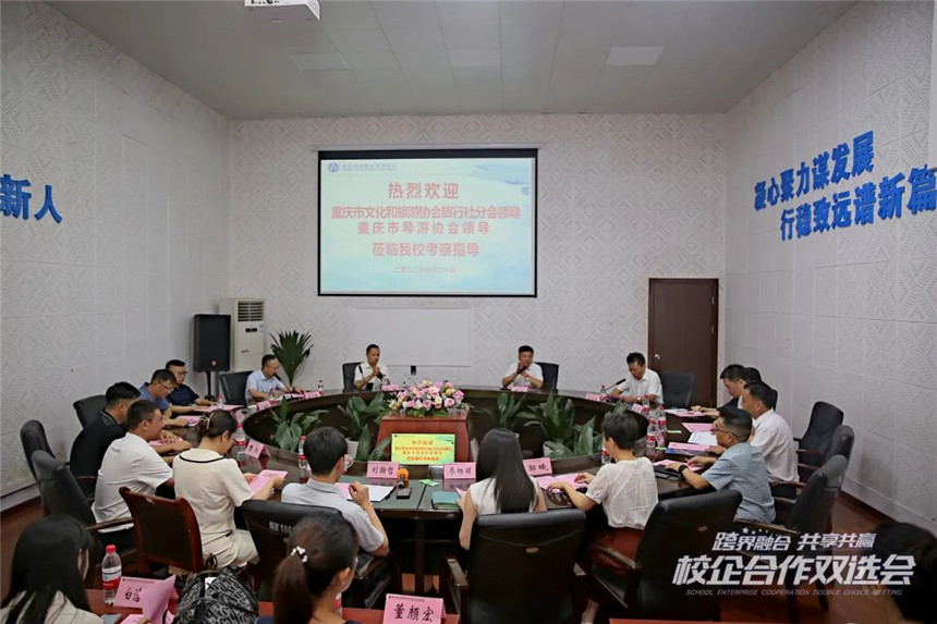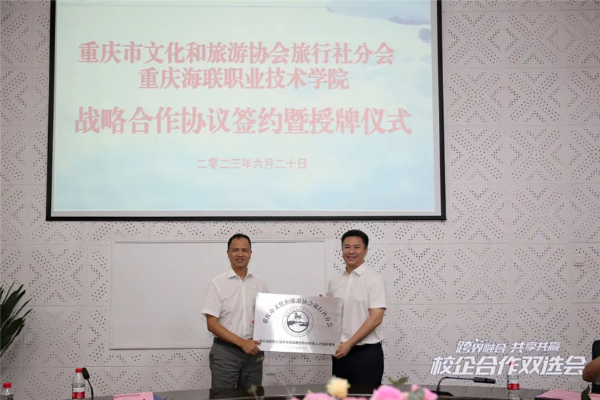买球官方网站与重庆市文化和旅游协会旅行社分会签订校企合作协议,进行授牌仪式。重庆市文化和旅游协会旅行社分会战略合作伙伴暨人才培养基地、买球官方网站实习实训基地正式落成!