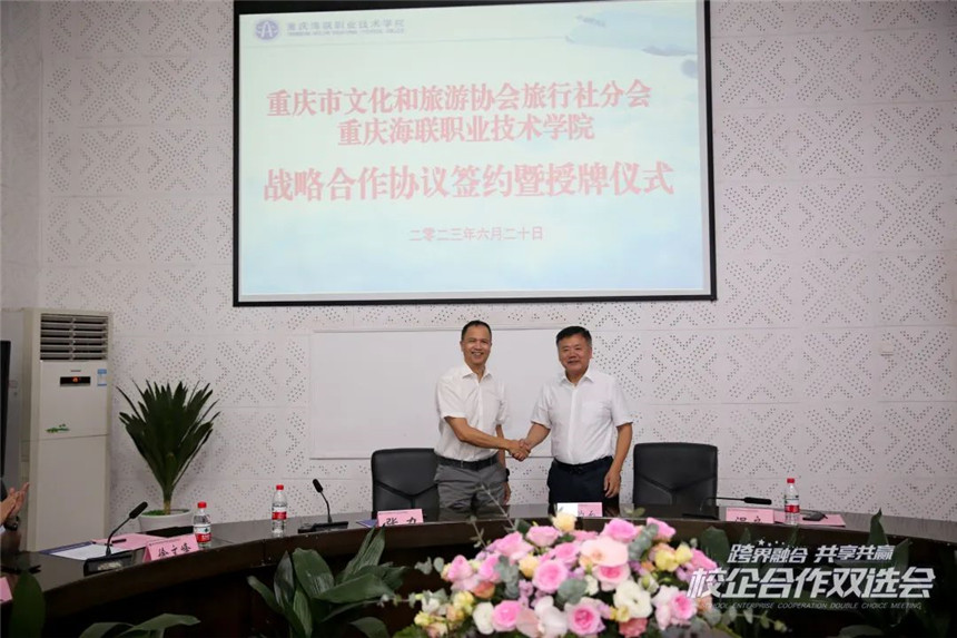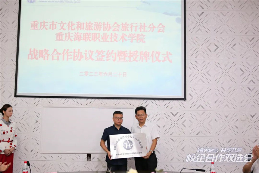 买球官方网站与重庆市文化和旅游协会旅行社分会签订校企合作协议,进行授牌仪式。重庆市文化和旅游协会旅行社分会战略合作伙伴暨人才培养基地、买球官方网站实习实训基地正式落成!