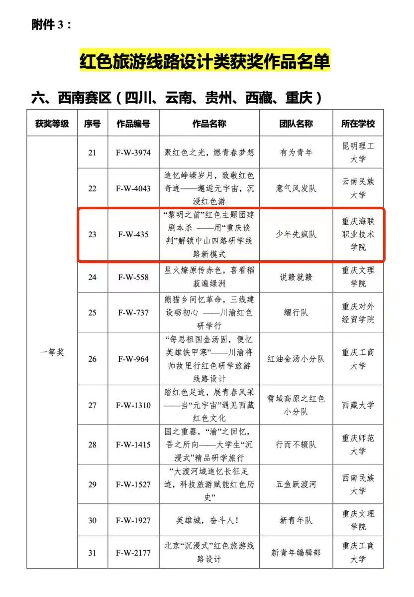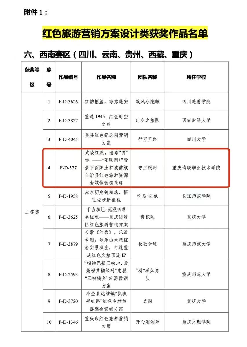 近日,由国家文化和旅游部资源开发司主办的第十三届全国大学生红色旅游创意策划大赛落下帷幕。买球官网携程文旅产业学院2022级学生代光杰、陈红、冉孟明、李梦驰、张胜楠组成的“少年先疯队”以作品《“黎明之前”红色主题团建剧本杀——用“重庆谈判”解锁中山四路研学线路新模式》荣获红色旅游线路设计类一等奖;2021级学生杨智程、周嘉卉、朱凯玉、王丹、叶应芳组成的“守卫银河队”以作品《武陵红旅,渝路“酉”你——“互联网+”背景下酉阳土家族苗族自治县红色旅游资源全媒体营销策略》荣获红色旅游营销方案设计类二等奖;两支团队指导老师曹承均荣获“优秀指导教师奖”。