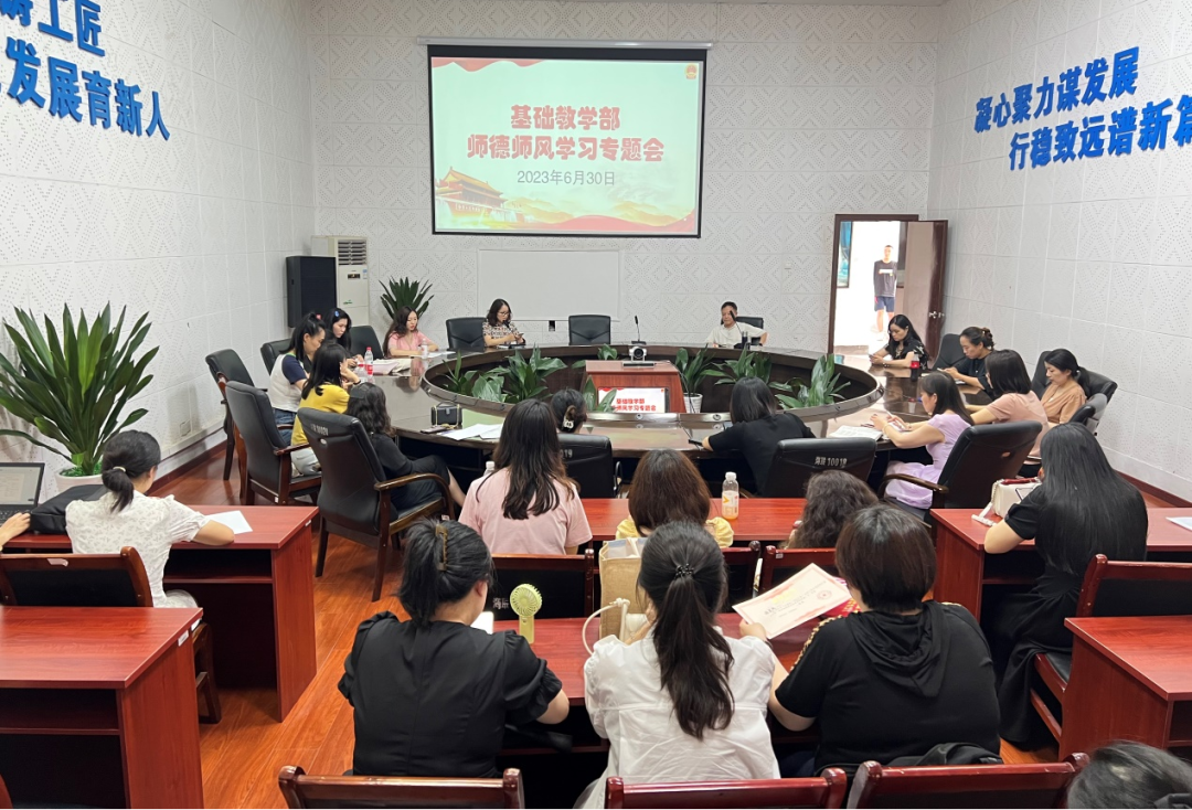 6月30日,基础教学部(思政部)召开师德师风学习专题会议,专题学习《新时代高校教师职业行为十项准则》,让思政教师进一步坚定理想信念,通过思想铸魂提升思政教师政治能力,夯实坚定拥护“两个确立”、坚决做到“两个维护”的思想根基。7月6日,思政部召开思政课建设专题会议,会上专题传达通报教育部公开曝光第十一批7起、第十二批7起违反教师职业行为十项准则典型案例。7月10日,学校6名思政教师参加市委党校专题培训。