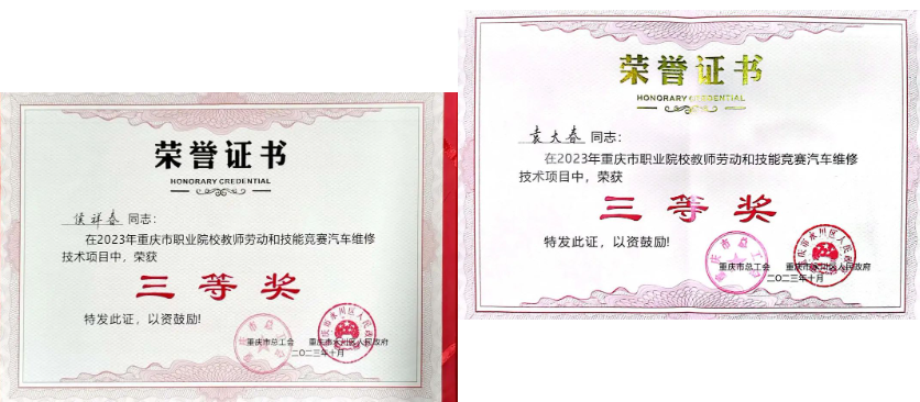近日,在2023年重庆市职业院校教师劳动和技能竞赛中,智能车辆工程学院教师袁大春、侯祥春参加汽车维修技术项目,和全市50所职业院校、160余名教师同台竞技,荣获汽车维修技术项目三等奖。