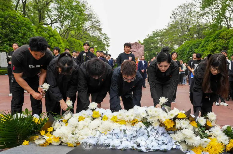 誓词宣读完毕,同学们依次敬献鲜花并绕墓一周进行缅怀,表达对先烈的崇高敬意和哀思。