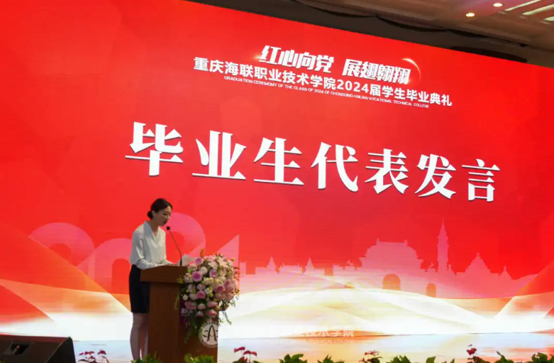 空中乘务学院周吉同学作为毕业生代表发言。她回顾了在海联三年的点点滴滴,感谢师长们的悉心教导、父母的辛勤培育和同学们的相互扶持。她的话语中充满了对母校的深情和对未来的憧憬,她的发言不仅代表了毕业生们的心声,更是展现了海联学子对未来的坚定信念。