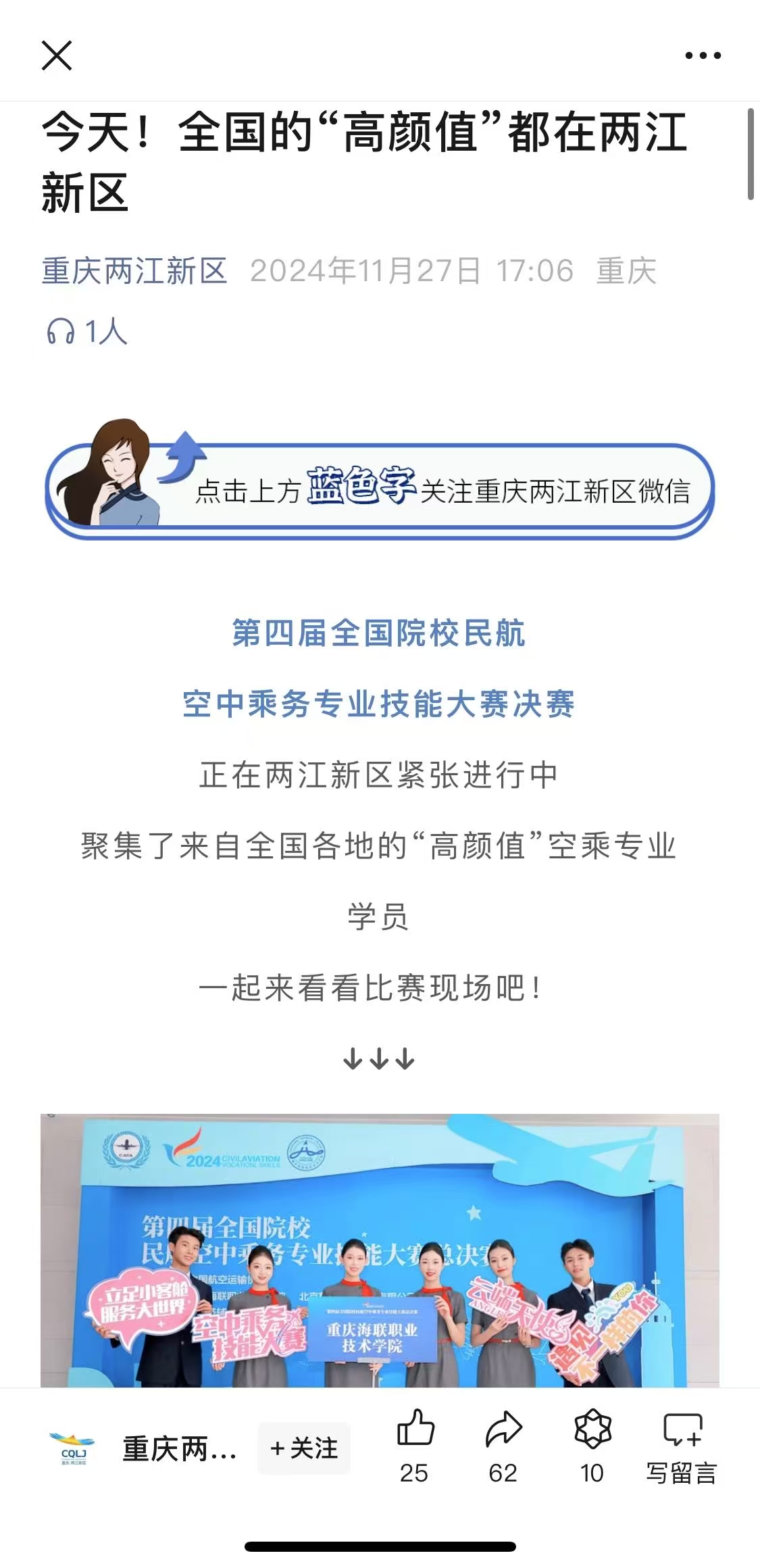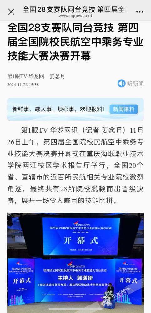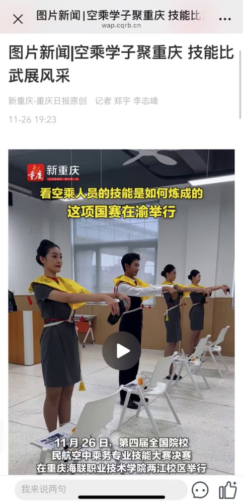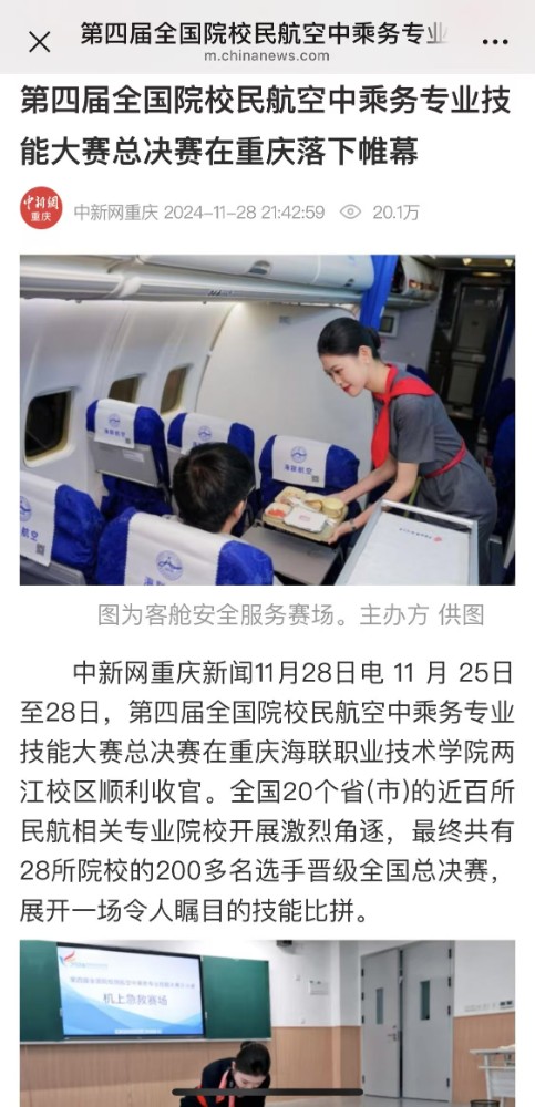 近日,第四届全国院校民航空中乘务专业技能大赛总决赛和第四届民航职业教育培训发展论坛在买球官网成功举办,多家官方媒体争相报道。中国新闻网浏览量超20万;开闭幕式直播观看人数累计超5万人次;大赛和论坛图片直播平台累计浏览量超10万人次;学校官方视频号、抖音号播放量超5万人次;微博话题最高实时热度位居重庆热搜第1名;全平台累计浏览量超100万人次!