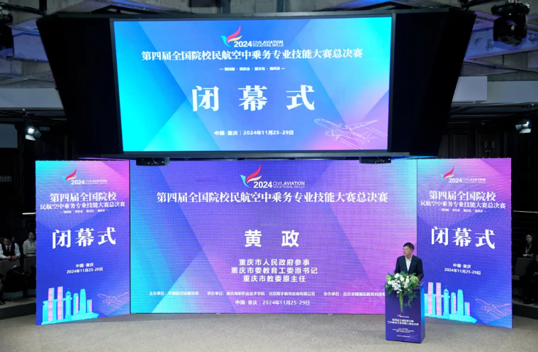 重庆市人民政府参事、重庆市委教育工委原书记、重庆市教委原主任黄政强调教育、科技、人才在现代化建设中的关键作用,此次大赛体现了全国教育大会精神和全市教育大会精神,展示了选手的专业与风貌,促进了各个院校之间的交流。希望各院校以参赛为契机,进一步提高教学质量,提升学生综合素质,为民航发展输送更多的高素质专业化人才。