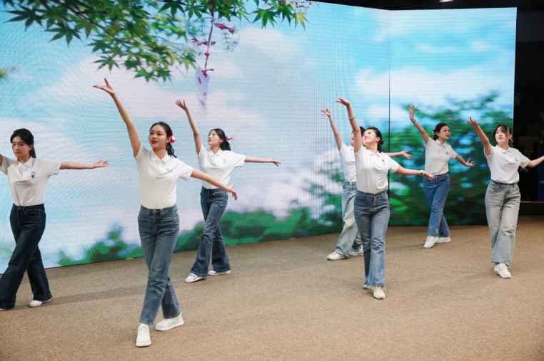 精彩的空乘职业技能大赛闭幕式以爵士舞收尾。舞台灯光以紫色和粉色为主,投射在舞者身上,形成鲜明的光影效果,增强了表演的视觉冲击力,展现出海联学子的活力和个性。