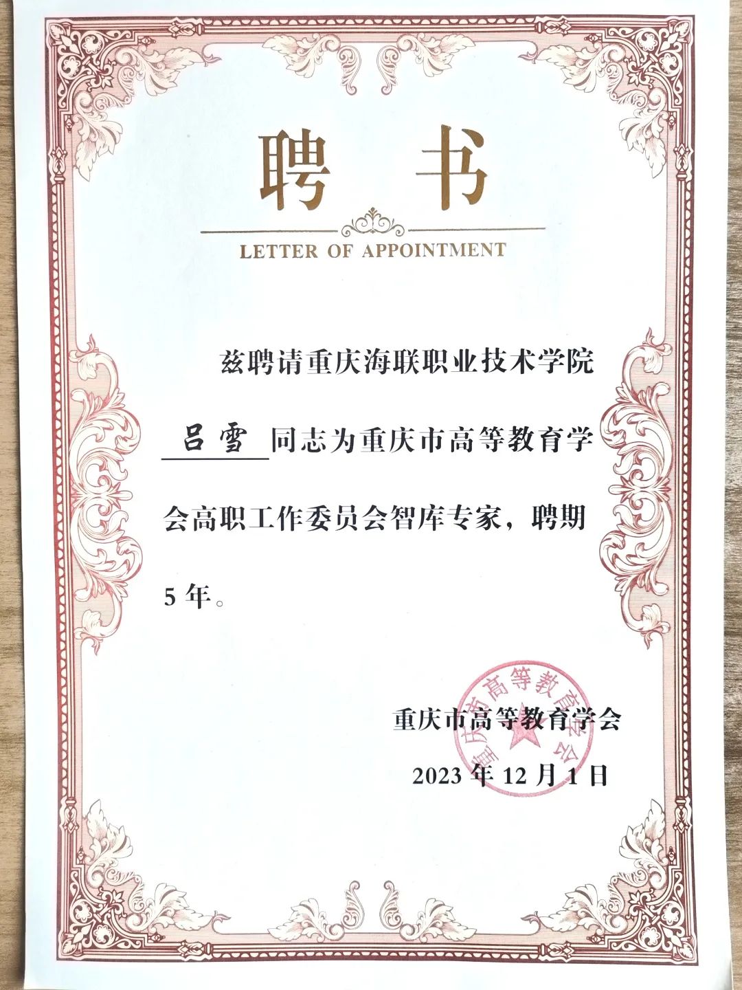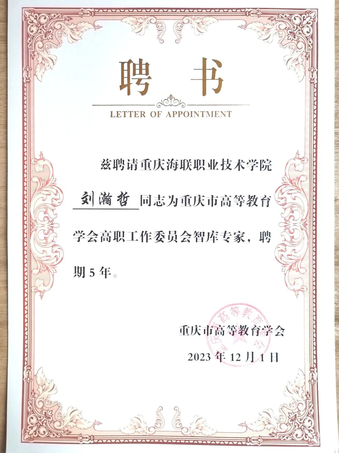 近日,根据《重庆市高等教育学会关于推荐高等职业教育智库专家的通知》(渝高学会发〔2023〕23 号)要求,经本人申请,学校推荐,重庆市高等教育学会审定,携程文旅产业学院院长刘瀚哲被聘为重庆市高等教育学会高职工作委员会智库专家(产教融合方向),智能车辆工程学院教师吕雪被聘为重庆市高等教育学会高职工作委员会智库专家(信息技术方向)。此次入选的2名专家是重庆市职业教育学会对买球官网专业群建设成效及建设经验的充分肯定。