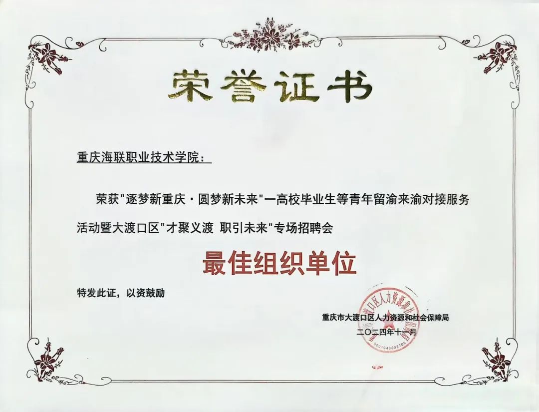 近日,买球官网荣获“逐梦新重庆·圆梦新未来”—高校毕业生等青年留渝来渝对接服务活动暨大渡口区“才聚义渡 职引未来”专场招聘会“最佳组织单位”。
