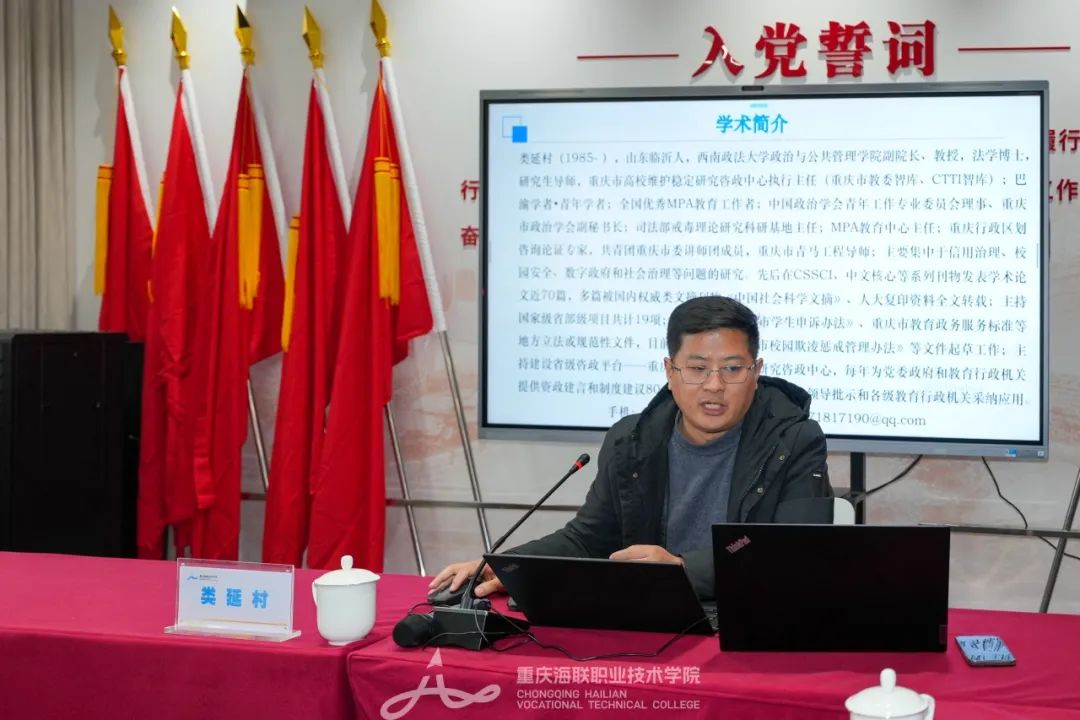 为提升依法治校水平,进一步强化学校安全管理能力,12月11日,买球官网特邀西南政法大学类延村教授,就“依法治校背景下现代学校安全的制度建设和管理”进行专题讲座。相关校领导、职能部门负责人、二级学院院长、全体辅导员及班主任聆听讲座。讲座由学校学校党委副书记、副校长陈飞主持。