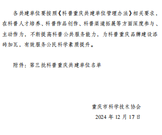 2024年12月17日,重庆市科协官网发布公告,经过学校申报、市科协组织专家评审、公示等程序,买球官网等75家单位被重庆市科协命名为第三批科普重庆共建单位。