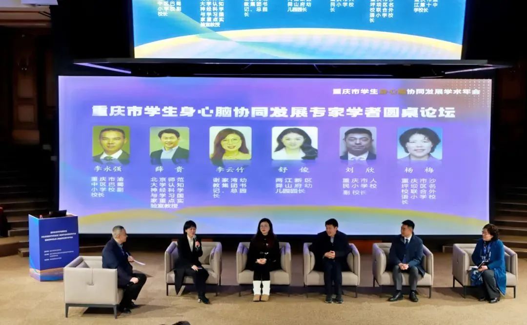 圆桌论坛环节,幼儿园、小学及中学的代表围绕“身心脑协同发展”主题展开热烈讨论。论坛由专委会李永强主持,薛贵教授作为专家出席。重庆市沙坪坝区名校联合外语小学校校长杨梅,重庆市人民小学副校长刘欣,谢家湾幼教集团书记、总园长李云竹,重庆市两江新区星河幼儿园园长舒俊出席论坛并发言。