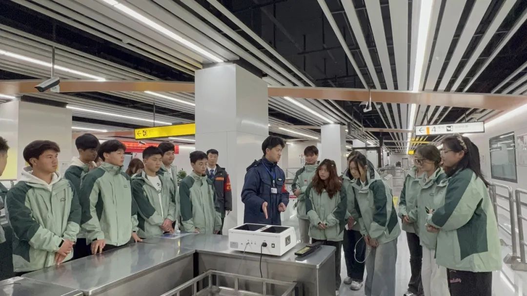 活动伊始,普福站汪涛站长及技术人员热情迎接学生们,带领他们开启了一场实操讲解之旅。在售票机、安检机、液检机及双向闸机处,技术人员详细介绍了设备的功能与操作要点,同学们听得津津有味,不时提问互动。随后,大家来到站台,认真学习发车信号动作规范,目睹了工作人员右臂旋转三圈、播报列车状态、确认安全等一系列严谨的操作流程,亲身感受轨道交通工作的专业与严谨。