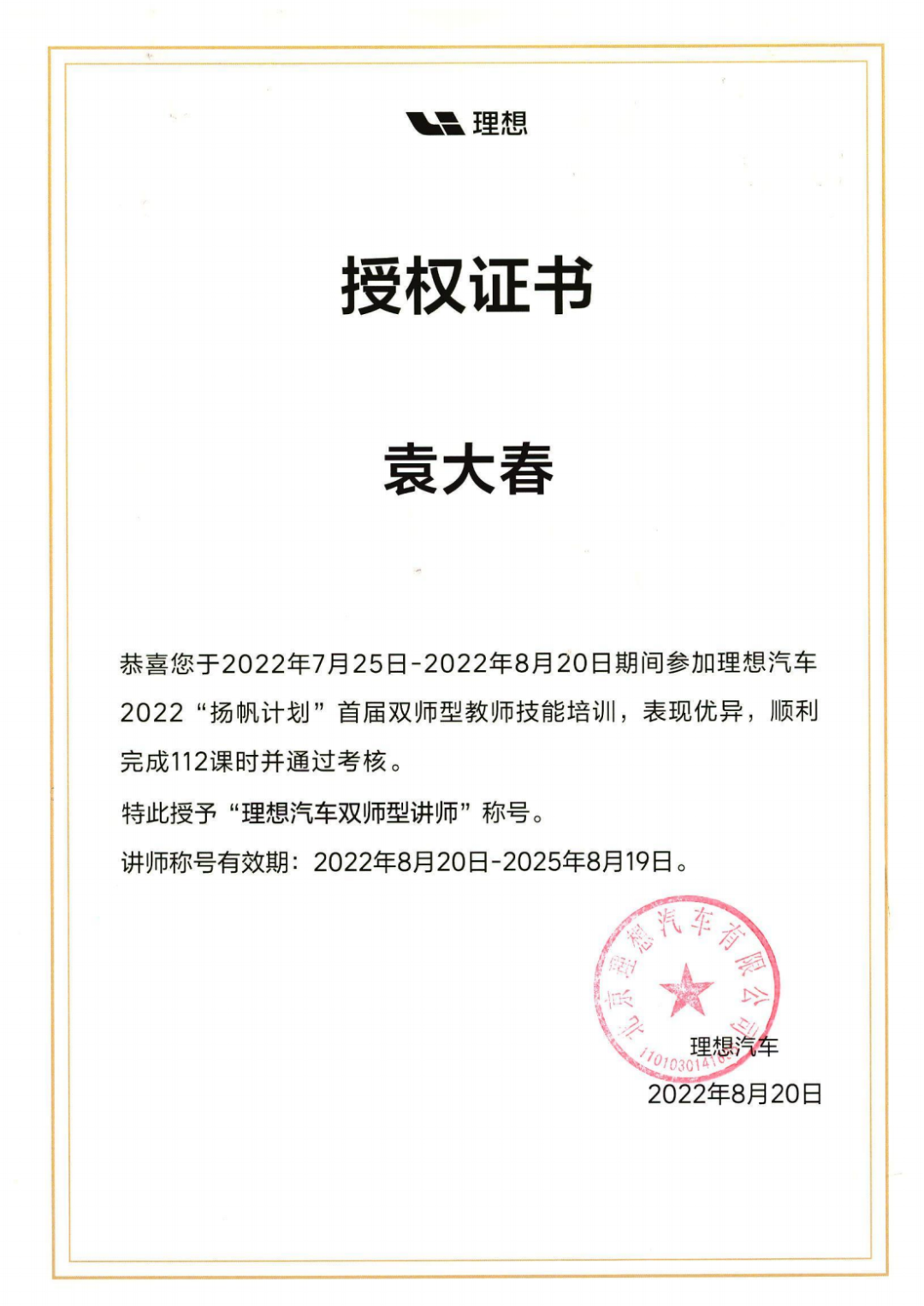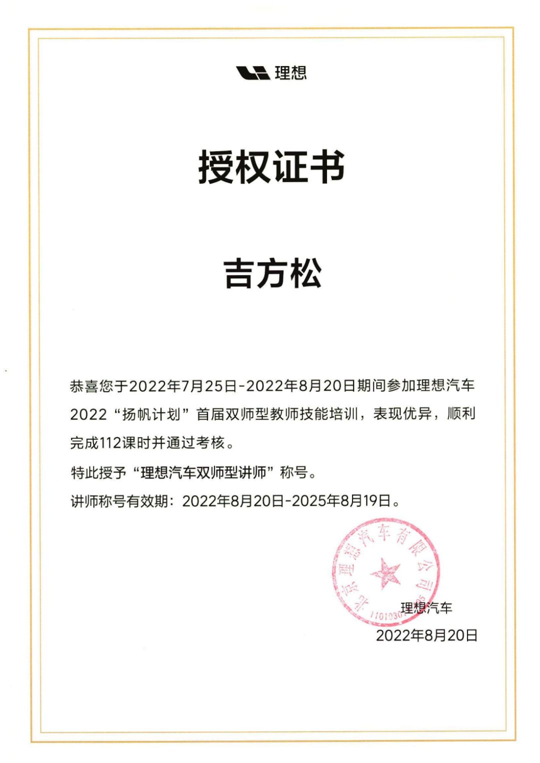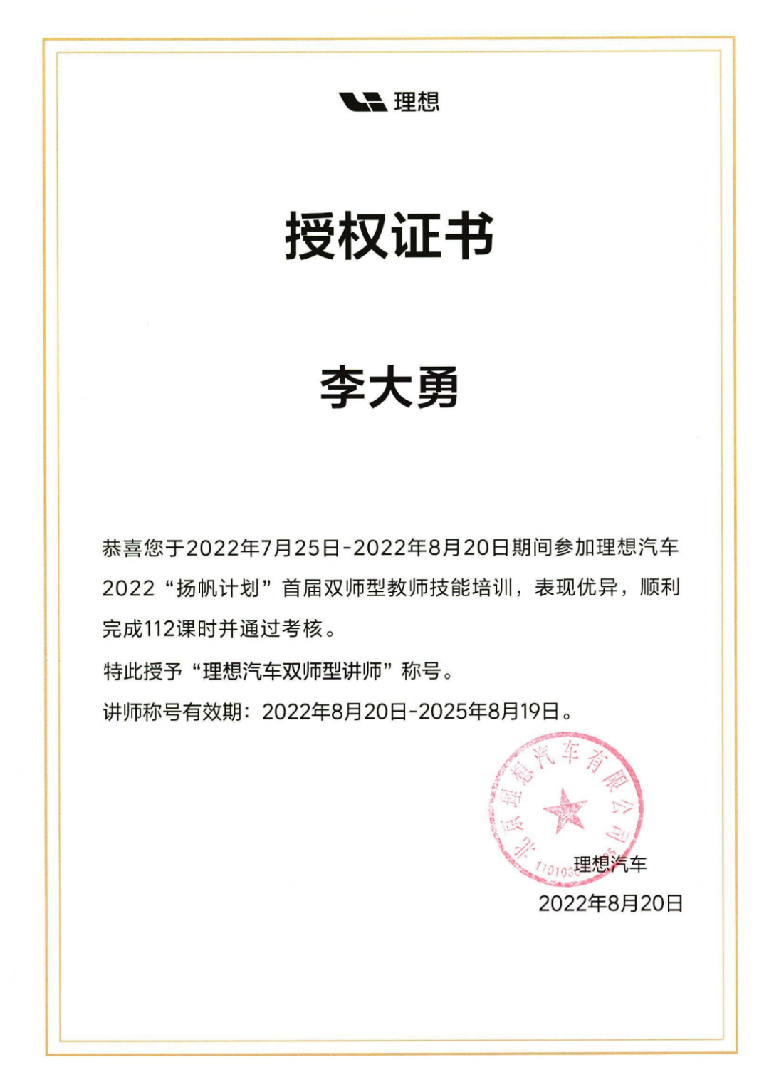 买球官网教师被授予“理想汽车双师型讲师”称号