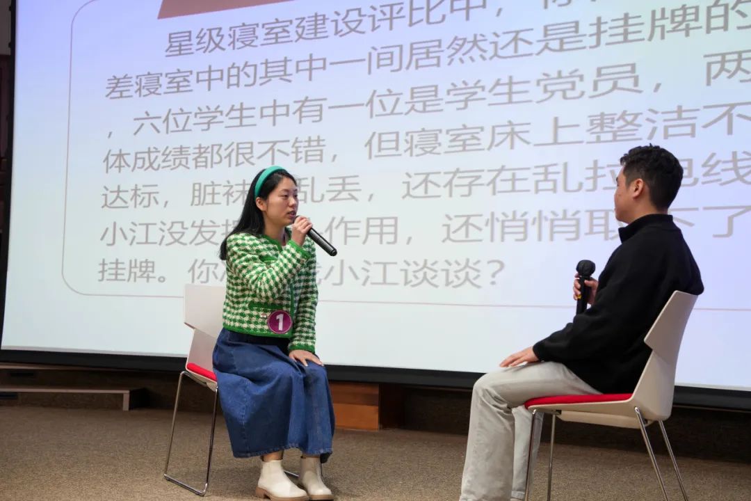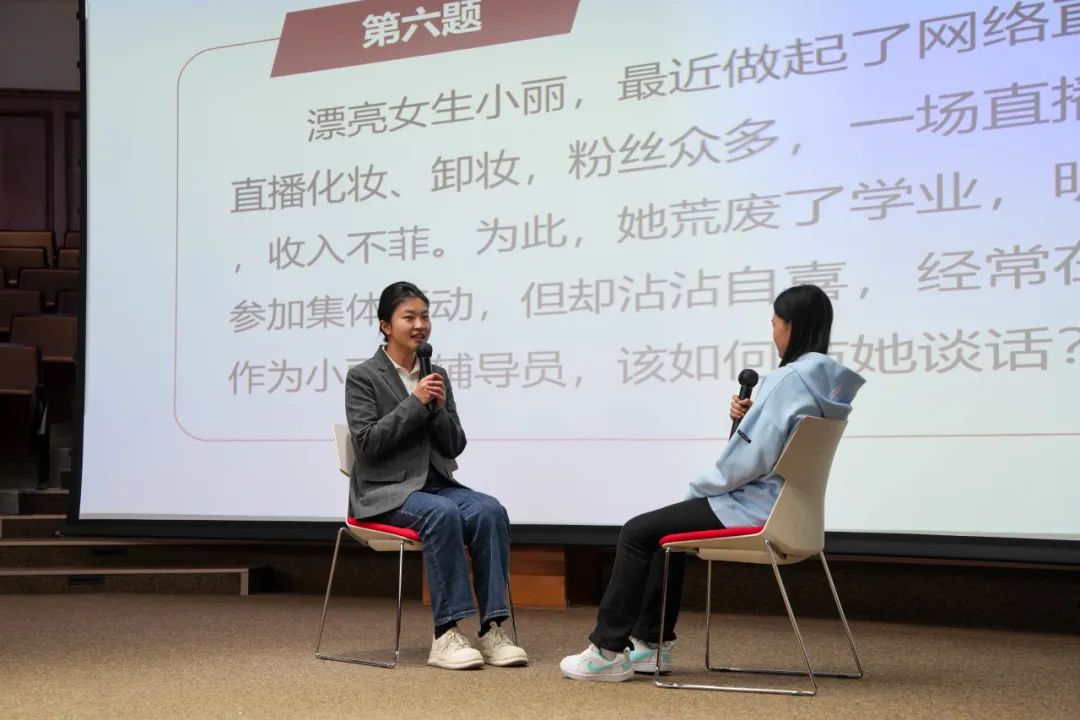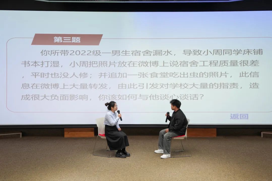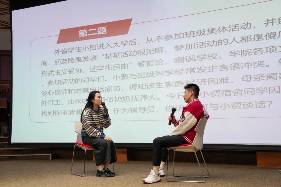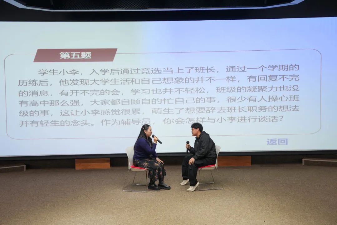 案例研讨环节,辅导员聚焦大学生思想政治教育热点与难点问题,在“你来我往,一问一答”中,由表及里、步步深入,充分彰显出扎实的理论素养和出色的逻辑思维能力。