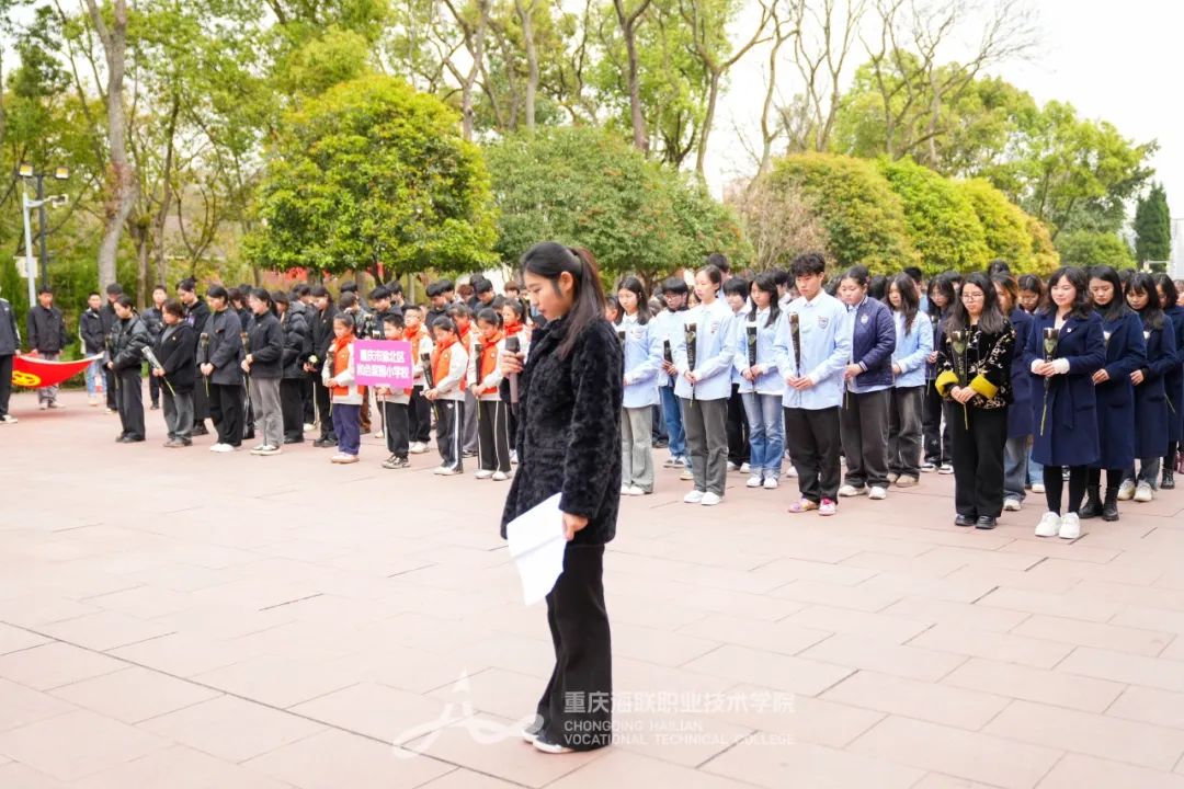 活动现场,全体师生整齐列队于革命烈士纪念碑前,垂首肃立,集体默哀,在无声的缅怀中激荡着传承信念。