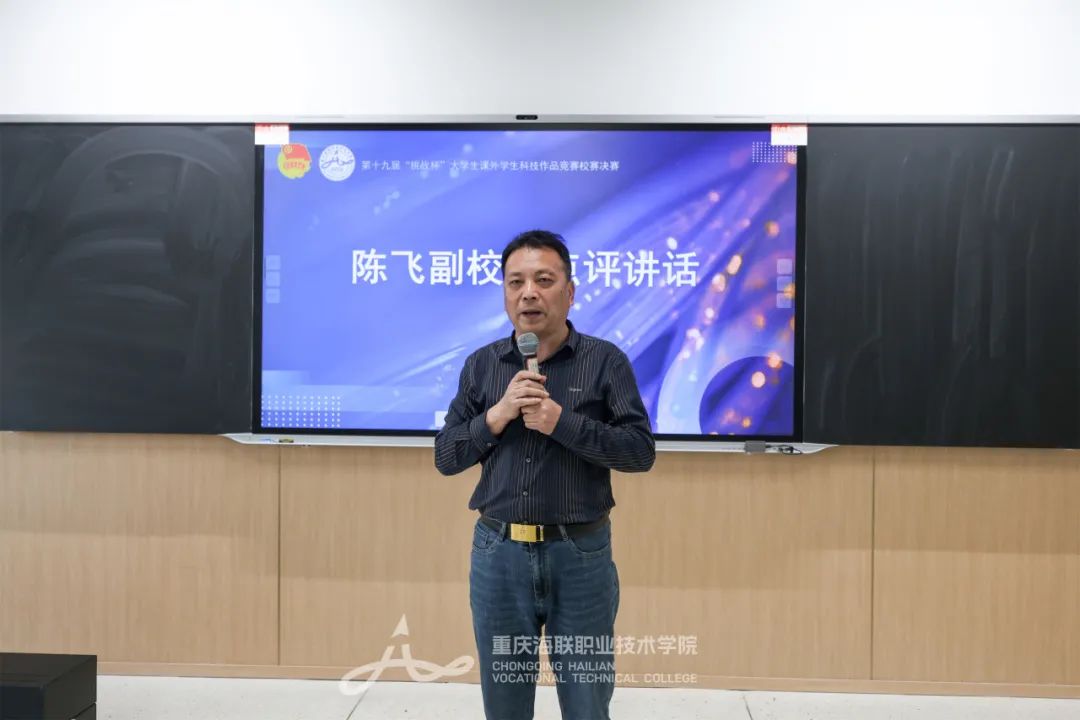 陈飞副书记对参赛团队的精彩表现表示高度肯定。他指出,比赛不仅是竞争的舞台,更是培训、交流与创新思维的平台。他强调,学校对此次赛事高度重视,选手们需要注重表达能力和仪表形象,并鼓励同学们保持自信,积极参与各类创新活动,勇于挑战自我。最后,他希望参赛选手能广泛寻求导师指导,贡献更多创新想法,同时积极投身体育、文艺与志愿服务活动,实现全面发展,努力为社会作出更大贡献。