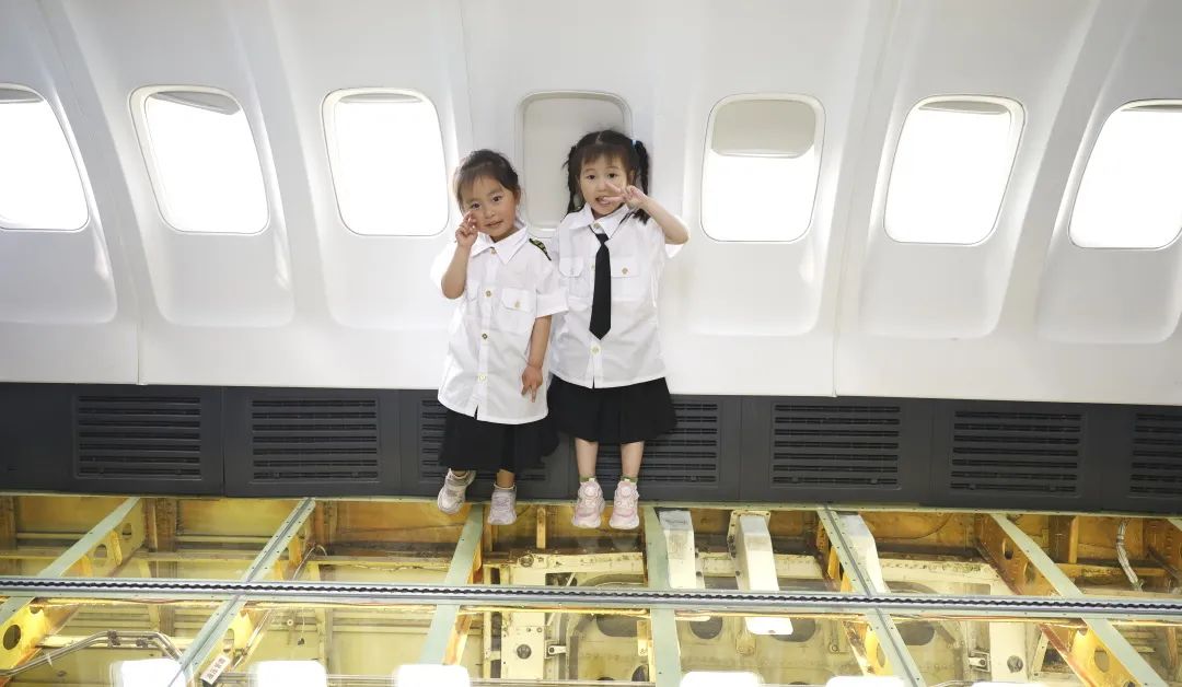 在驾驶舱中,他们认真听完海联大哥哥大姐姐的讲解后,迫不及待地伸手去摸操纵杆,小手一推一拉,嘴里还模仿着飞机起飞的声音:“呜——”,感受到飞行的魅力。