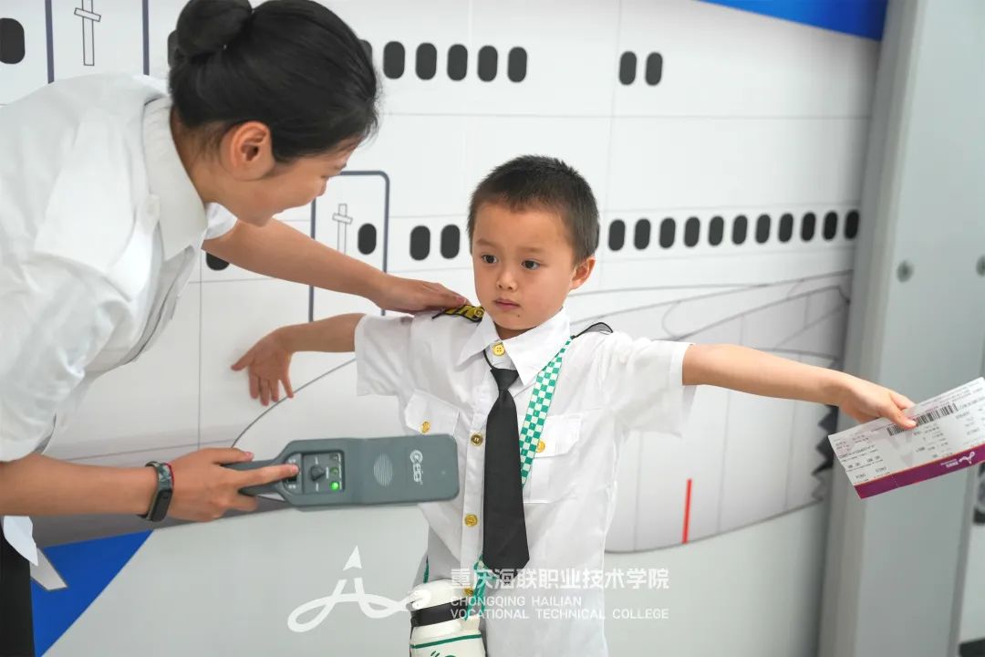 小朋友们拖着自己的行李箱依次通过安检,在触发警报的瞬间,海联学子化身“安检卫士”和“科普达人”详细讲解相关知识,让小朋友们认识到安检的重要性,以及违禁品对航空安全的威胁。