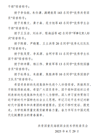 “五四”表彰大会不仅是对优秀集体和个人的肯定与鼓励,更是一次生动的大思政课,进一步激发了海联青年学子的责任感和使命感。下一步,学校将切实加强对青年学生的思想政治引领,关心关爱青年,为青年成长成才提供舞台、厚植沃土,引领广大青年在强国建设和中华民族伟大复兴的赛道上,跑出加速度、赛出好成绩。