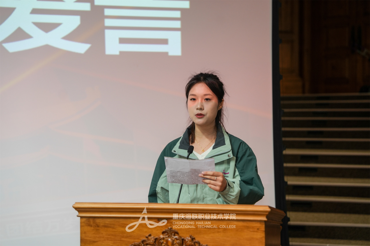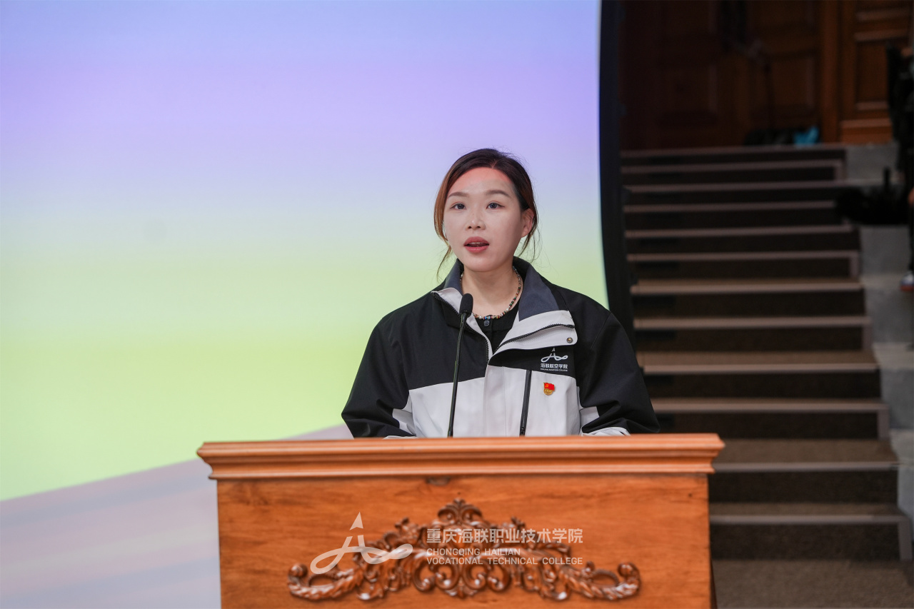 空中乘务2412班团支部书记胡盈盈同学代表“五四红旗团支部”发言。她表示,团支部始终秉持“服务、凝聚、引领青年”的宗旨,积极践行“五四”精神,提升团员思想觉悟和实践能力。未来将带领支部成员在学习、生活和志愿服务中持续发挥先锋模范作用,用行动践行“爱党爱国爱校”。