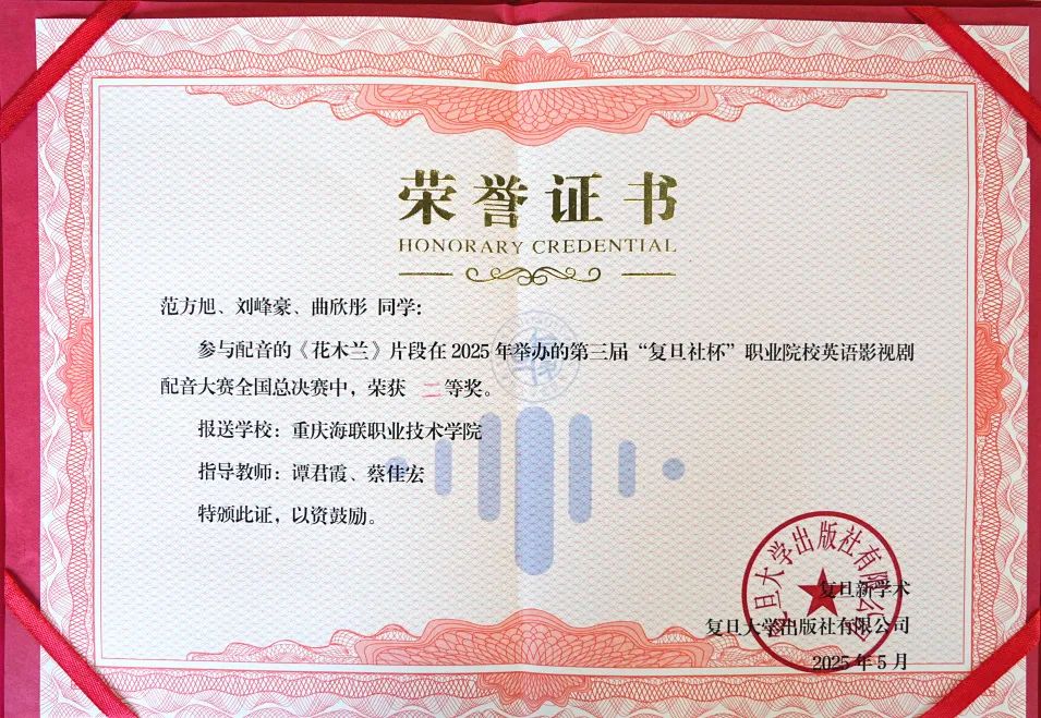 5月10日,第三届“复旦社杯”职业院校英语影视剧配音比赛全国决赛圆满落幕。在学校谭君霞和蔡佳宏老师的指导下,由范方旭、刘峰豪、曲欣彤3名同学组成的参赛队伍凭借精湛的配音技艺和深刻的情感表达,从众多参赛队伍中脱颖而出,斩获全国二等奖,为学校再添荣誉,展现了海联学子扎实的专业素养和卓越的团队协作能力。