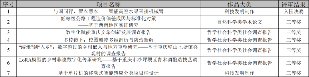 学校共报送项目10项,经组委会评审,其中,1项作品入围决赛、6项作品获得三等奖。这份荣誉是对买球官网教育教学、人才培养及学生潜力的高度认可。以下是重庆市选拔赛复赛中,买球官网学子的获奖作品名单: