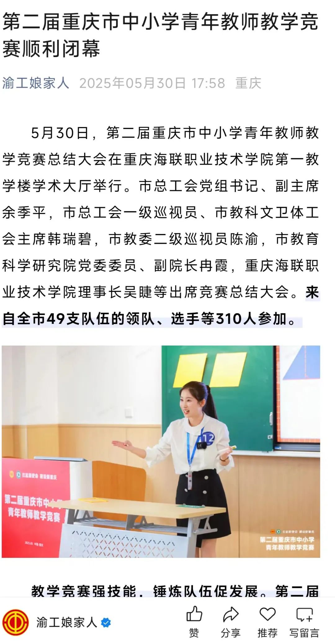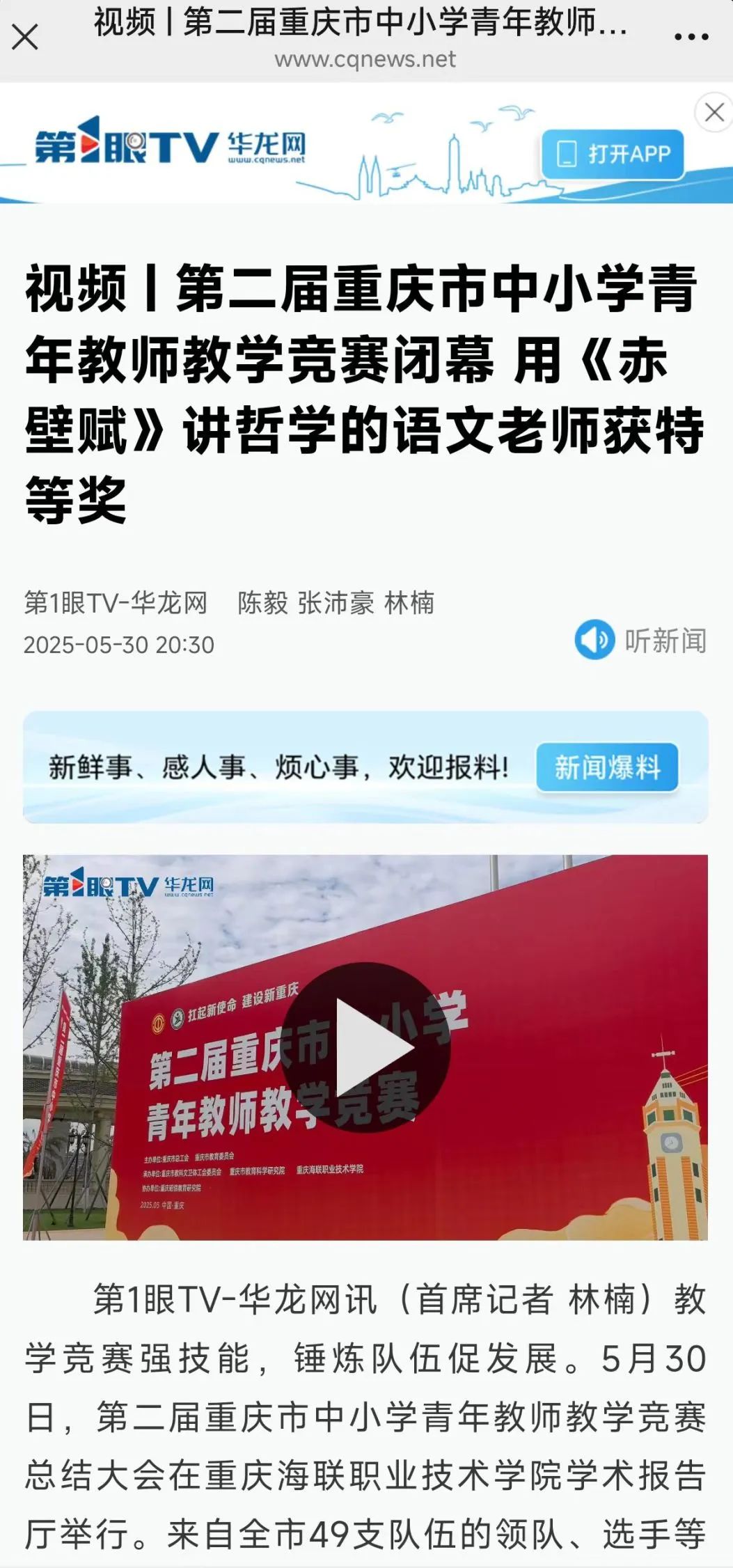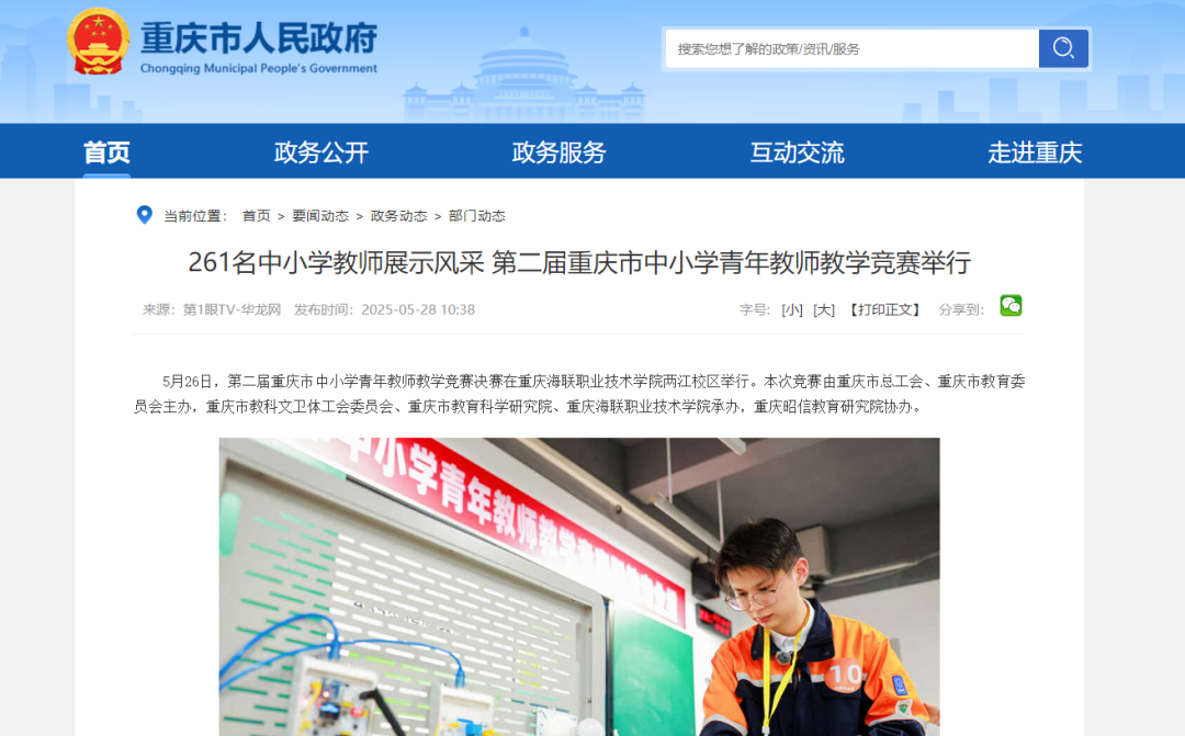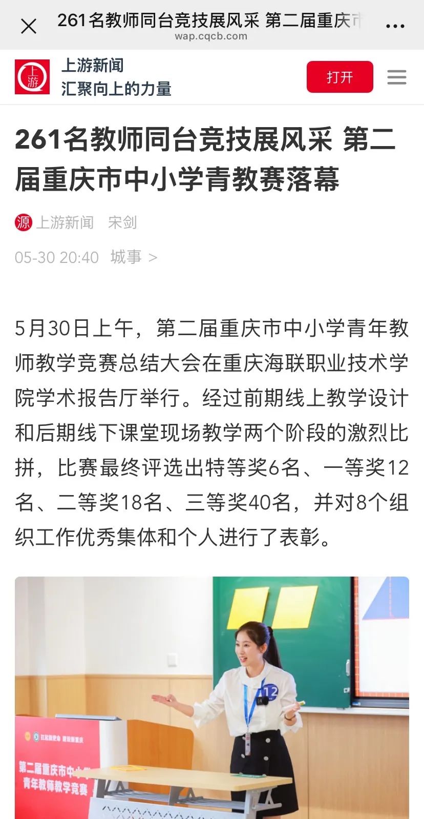重庆市人民政府网以《261名中小学教师展示风采 第二届重庆市中小学青年教师教学竞赛举行》为题,聚焦赛事亮点、教师风采以及海联学院的出色表现对本次竞赛进行报道,并给予高度评价。以下是主流媒体报道原文(附链接):