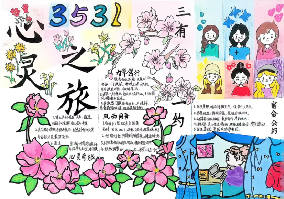 此次心理之家手抄报比赛,参与同学数量和作品数量再创新高,共收到311份班级和宿舍手抄报。参赛作品集文字、图画、色彩于一体,风格各异、精彩纷呈,充分展现了同学们对班级建设的思考、对共建宿舍家园的努力。