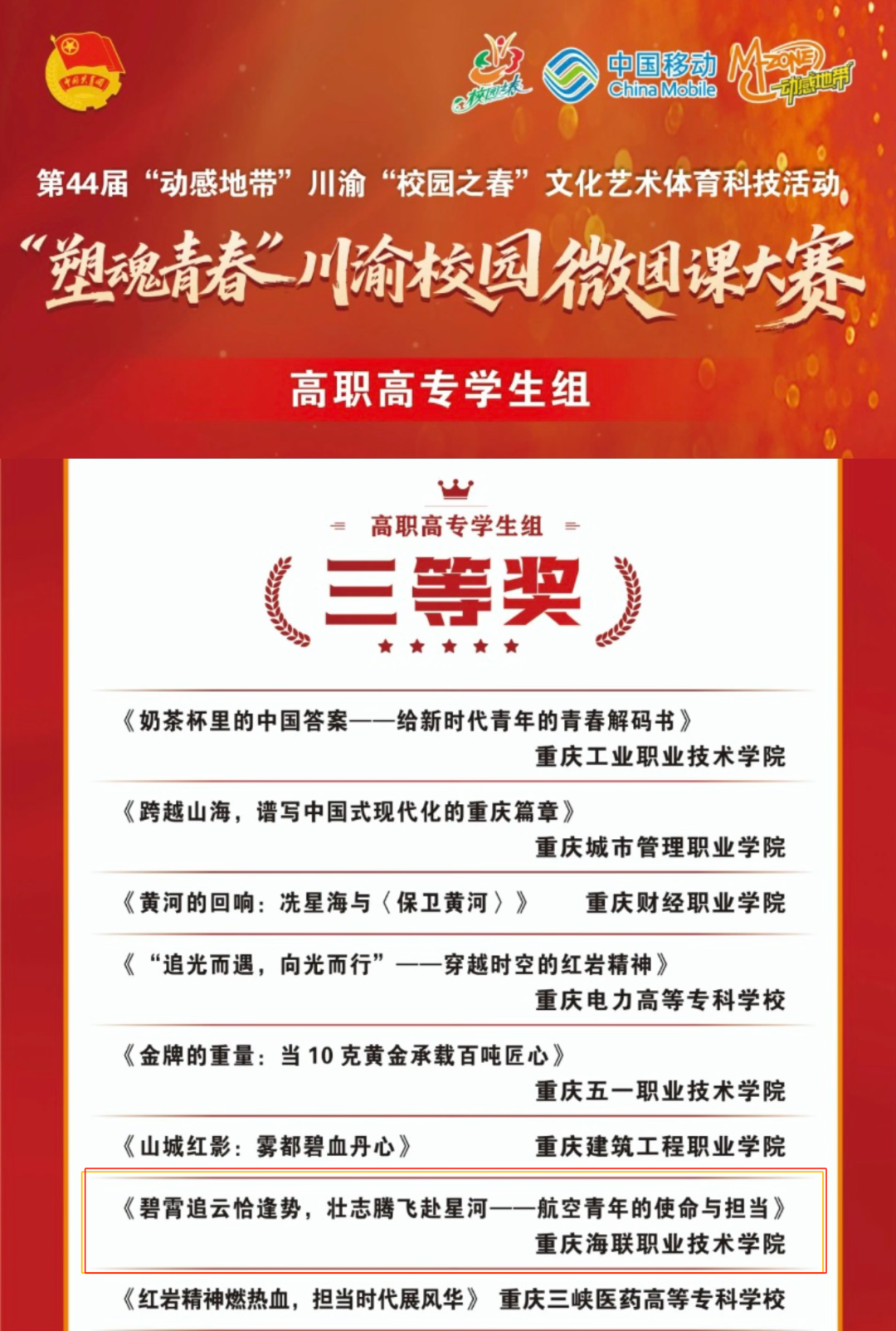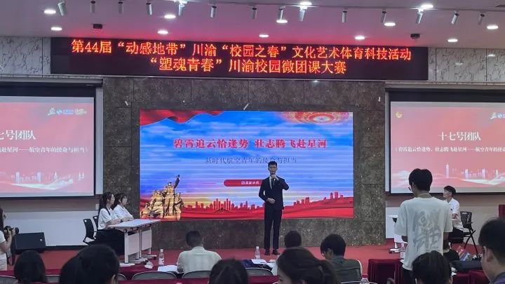 6月15日—16日,由团市委联合市委教育工委、市教委、市体育局、团四川省委、市科协、市学联、四川省学联主办的第44届“动感地带”川渝“校园之春”文化艺术体育科技活动之“塑魂青春”川渝校园微团课大赛决赛圆满落幕。经过激烈角逐,由曾夏、黄倩老师指导、蒋慧婷老师带队,来自航空工程学院的全英豪、李渝、曹慧如、张涛、胡洪御同学参演的微团课作品《碧霄追云恰逢势,壮志腾飞赴星河——航空青年的使命与担当》荣获高职高专学生组三等奖。