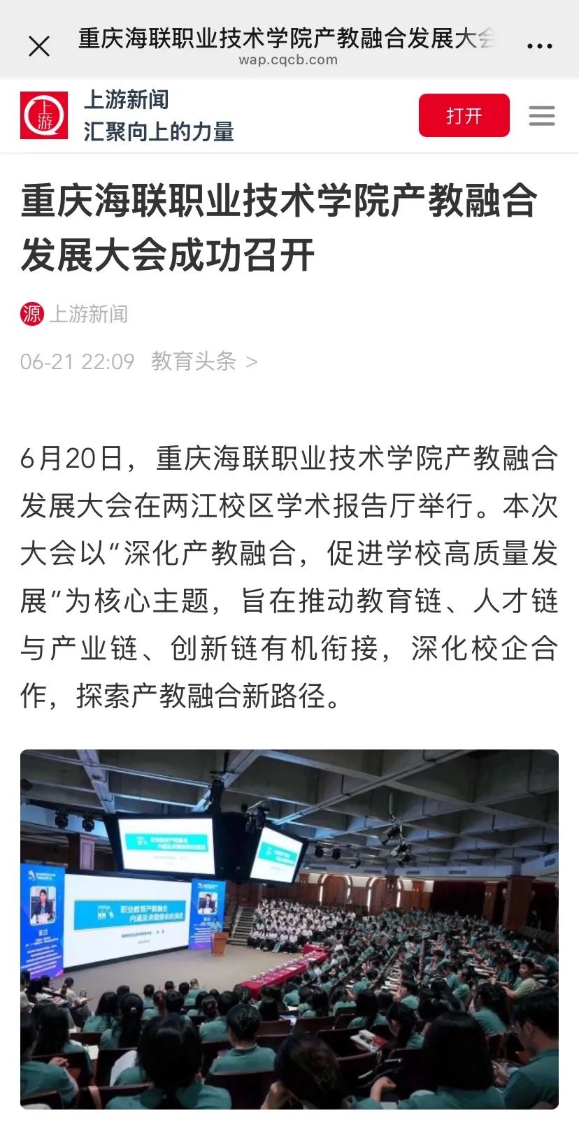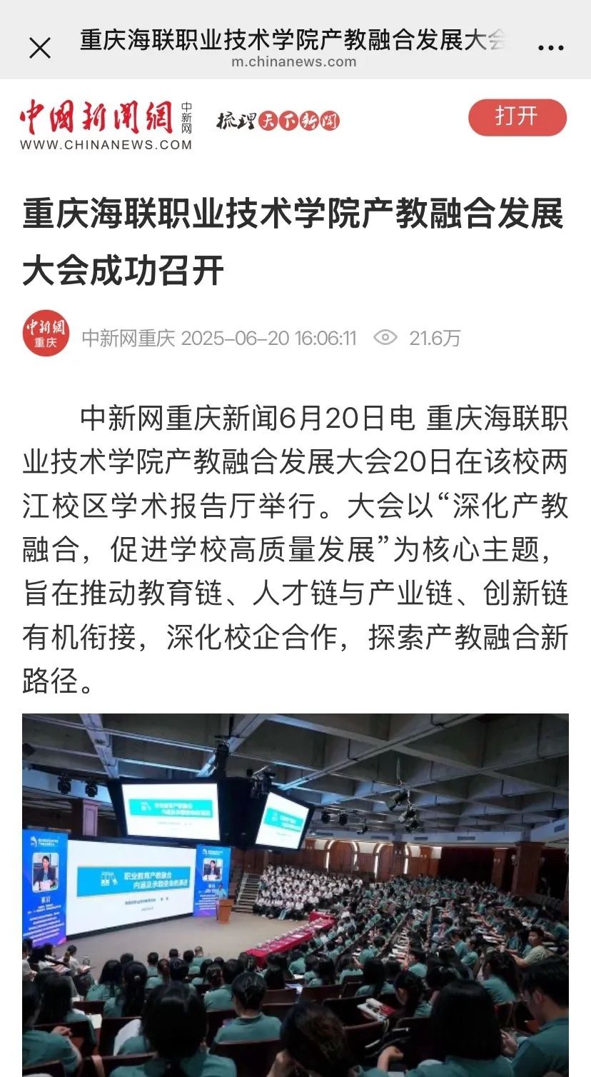 此次大会的召开是学校深入贯彻落实国家职业教育改革与创新战略的重要举措,受到各大媒体的广泛关注,中国新闻网、重庆日报、上游新闻等多家媒体对大会进行了报道。一起来看看都有哪些媒体报道了大会↓↓↓