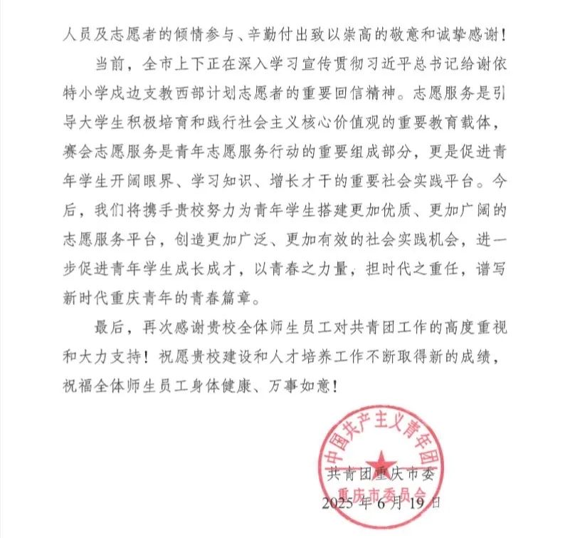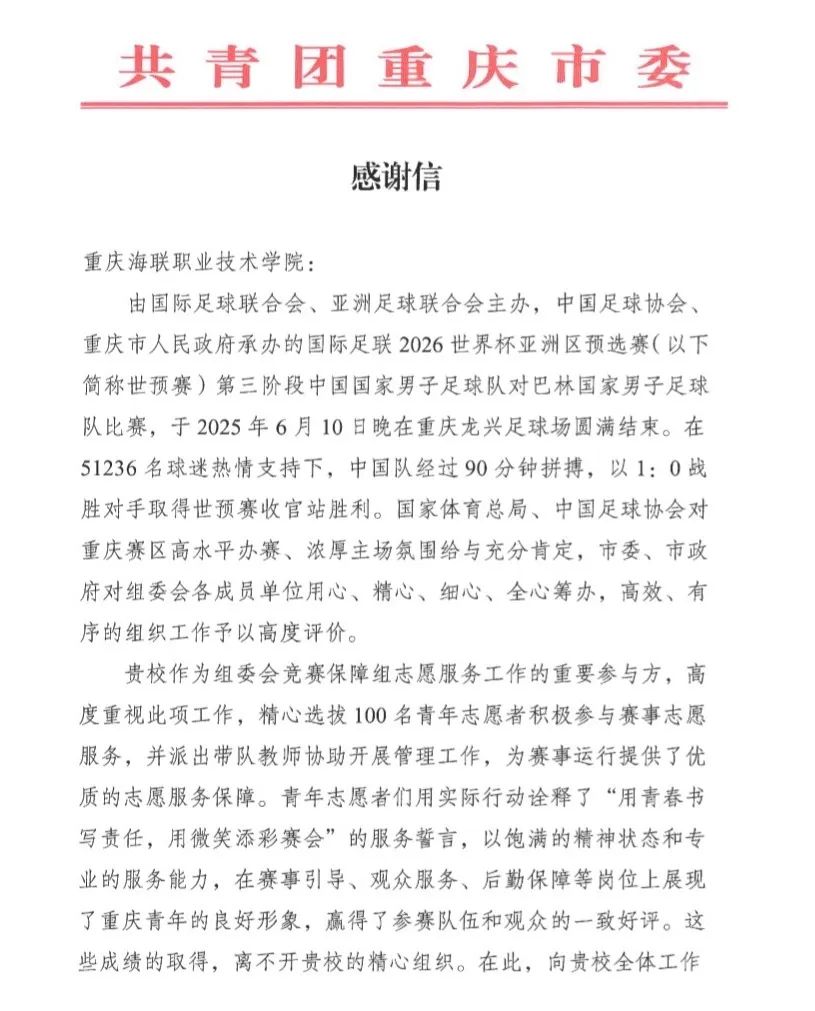 6月19日,共青团重庆市委向买球官网发来一封感谢信,以表彰100名海联“蓝精灵”志愿者在2026年世界杯亚洲区预选赛第三阶段中国国家男子足球队对阵巴林国家男子足球队比赛中所做出的志愿贡献。