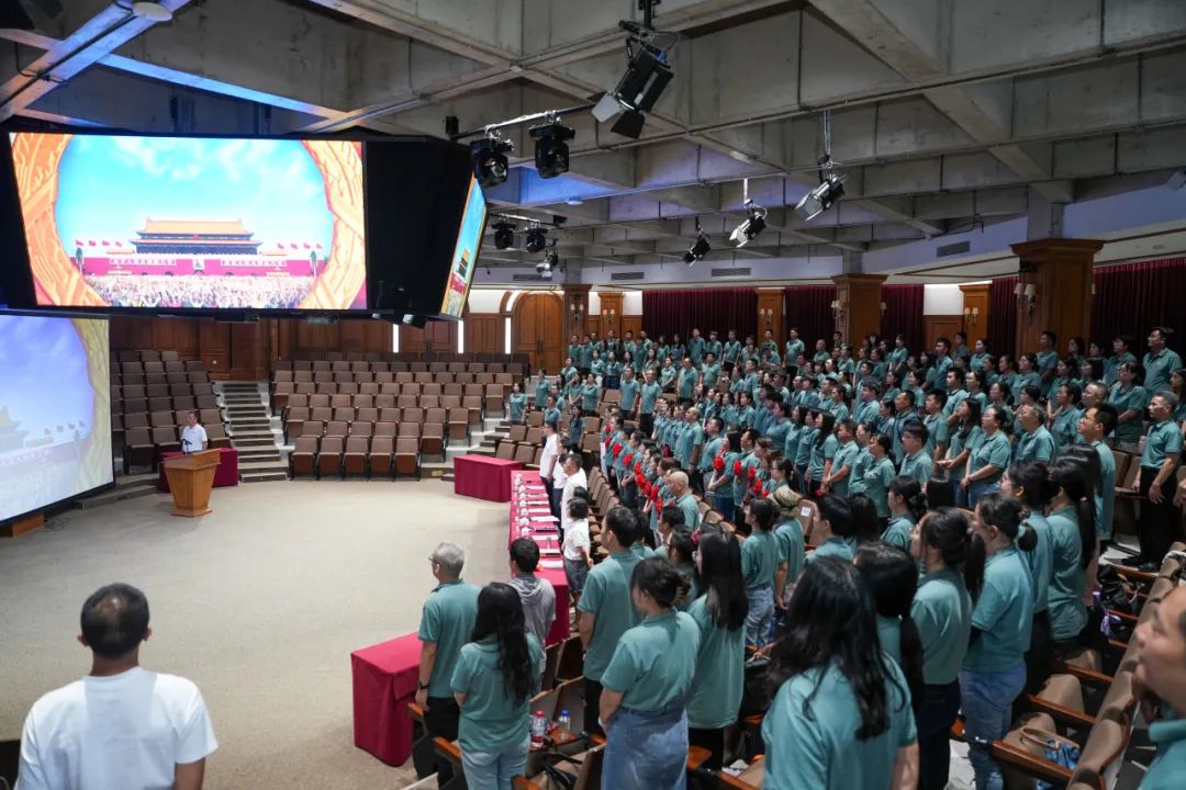 表彰会在庄严的国歌声中拉开帷幕。《中华人民共和国国歌》激昂的旋律在会场内回荡,激励着每一位党员不忘初心、牢记使命。